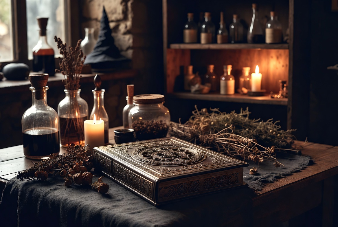 A wooden table holds an ornate leather-bound book, glass potion bottles filled with dark liquids, and flickering candles. Dried herbs, branches, and jars surround the items on a dark cloth. A stone-walled room with wooden shelves stocked with more bottles and a witch's hat in the background adds to the mystical setup.