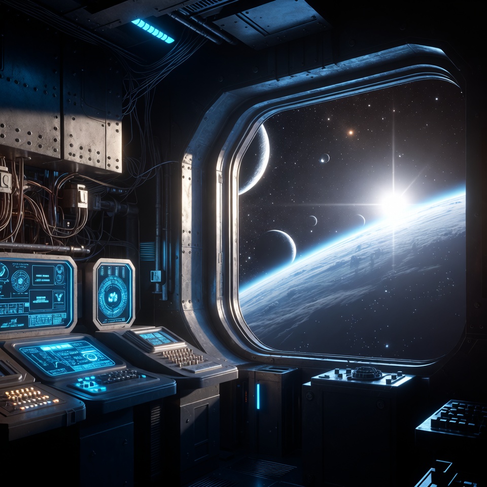 Earth, astronaut view, cockpit, control panels, cosmos, dashboard, futuristic, galaxy, interior, keyboards, metallic, monitors, nebula, neon lights, orbit, planet, porthole, sci-fi, screens, space, space station, spacecraft, stars, sun, window, spaceship