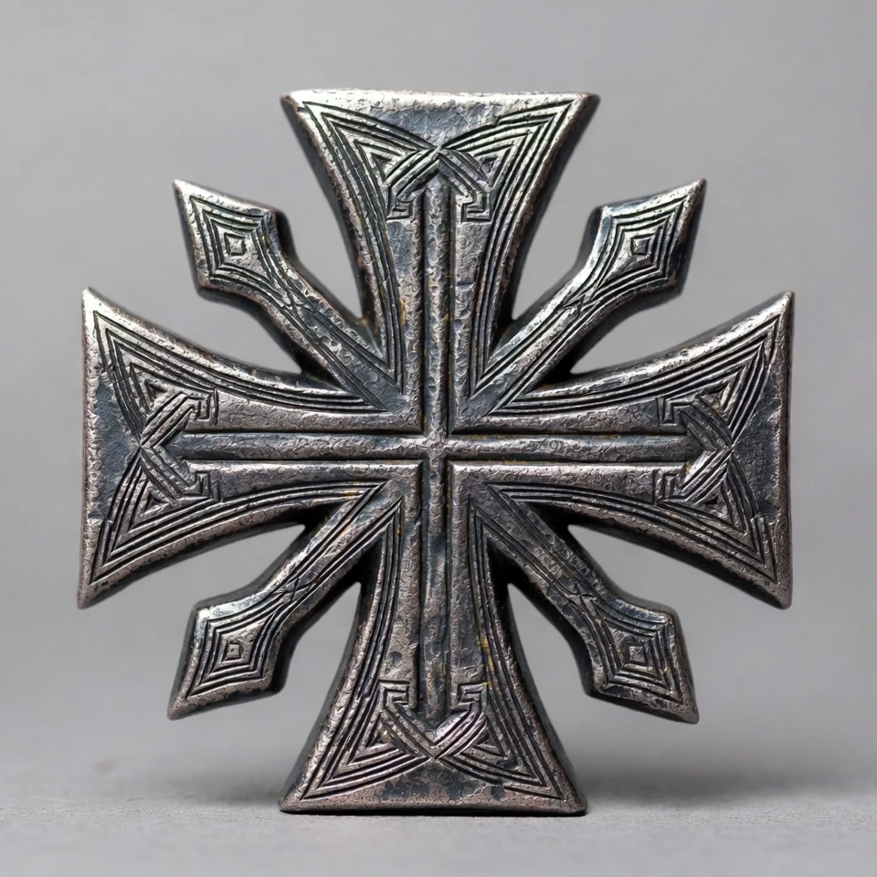 A detailed metallic iron cross with intricate geometric patterns and pointed extensions on each arm. The cross features engraved Celtic-style motifs and a weathered gray finish. It is centered against a plain light gray background.