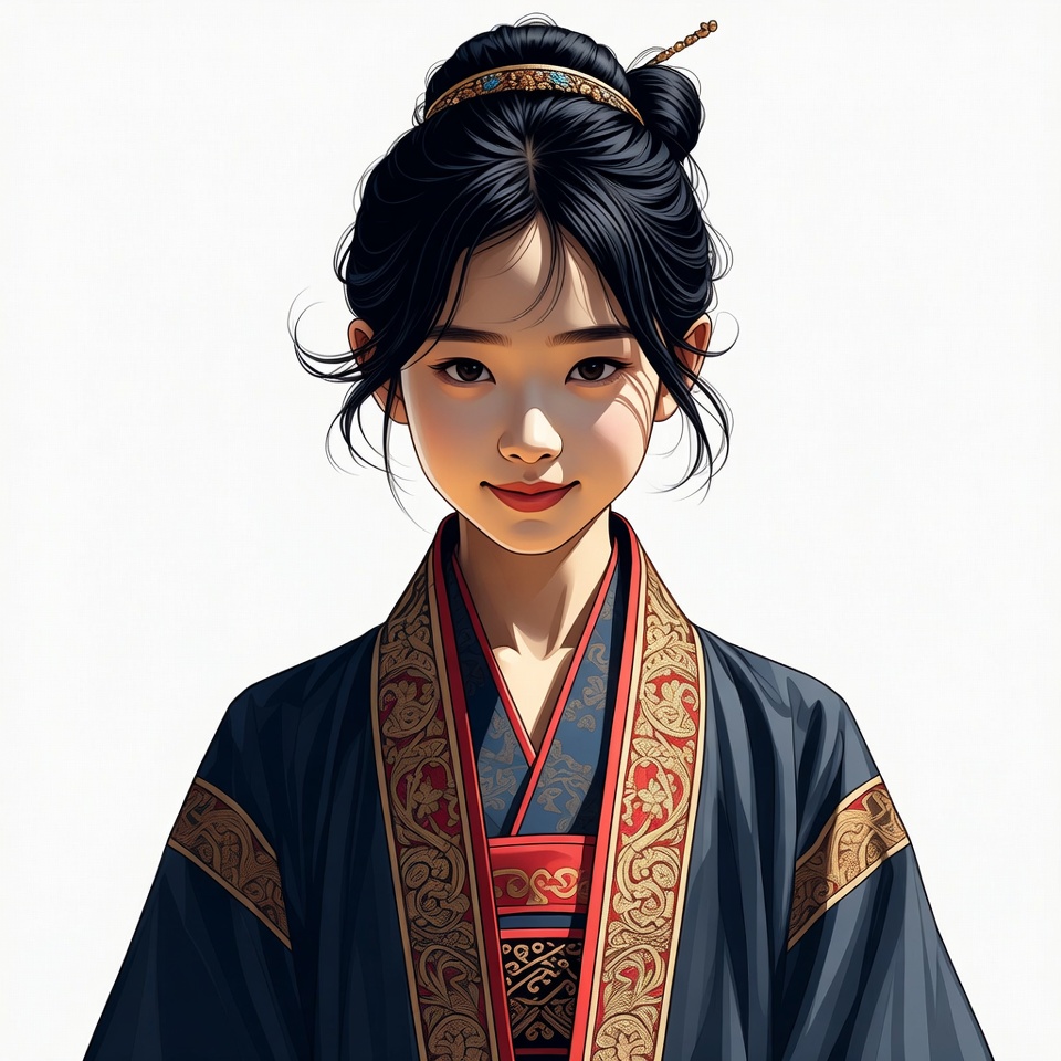 A young Asian woman with black hair styled in an elegant updo adorned with turquoise jewelry smiles gently at the viewer. She wears a traditional navy blue hanfu with intricate red and gold embroidery along the collar and edges. The illustration is set against a plain white background.