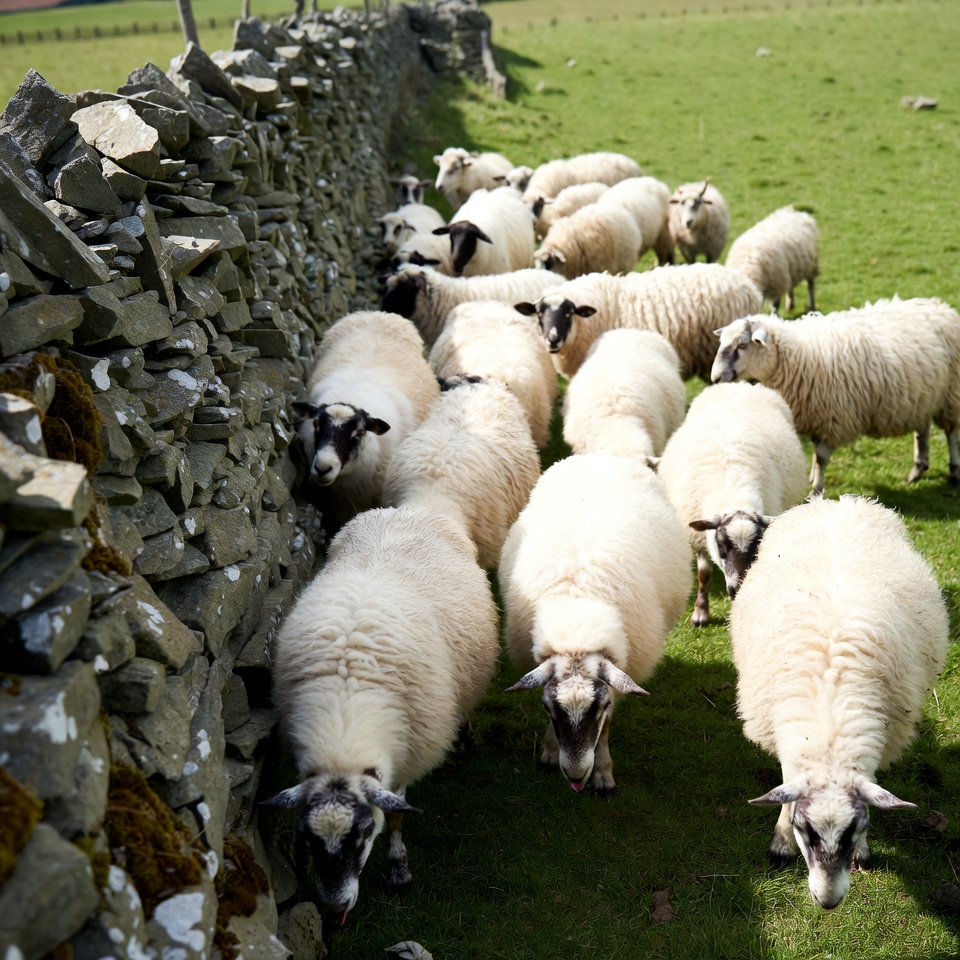 animals, black faces, countryside, dry stone, farm, field, flock, grass field, grazing, green grass, herd, livestock, meadow, mossy wall, pastoral, rural, sheep herd, stone wall, white sheep, sheep