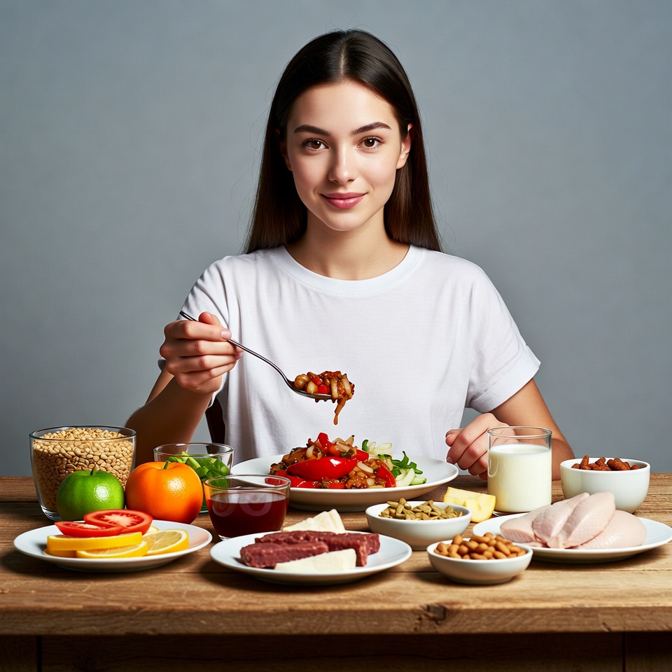 A young woman with long dark hair sits at a wooden table, holding a spoon with food from a plate of peppers and vegetables. She wears a white t-shirt and smiles at the camera. The table is filled with various healthy foods including grains, fruits, nuts, cheese, milk, and smoked meats on a gray background.