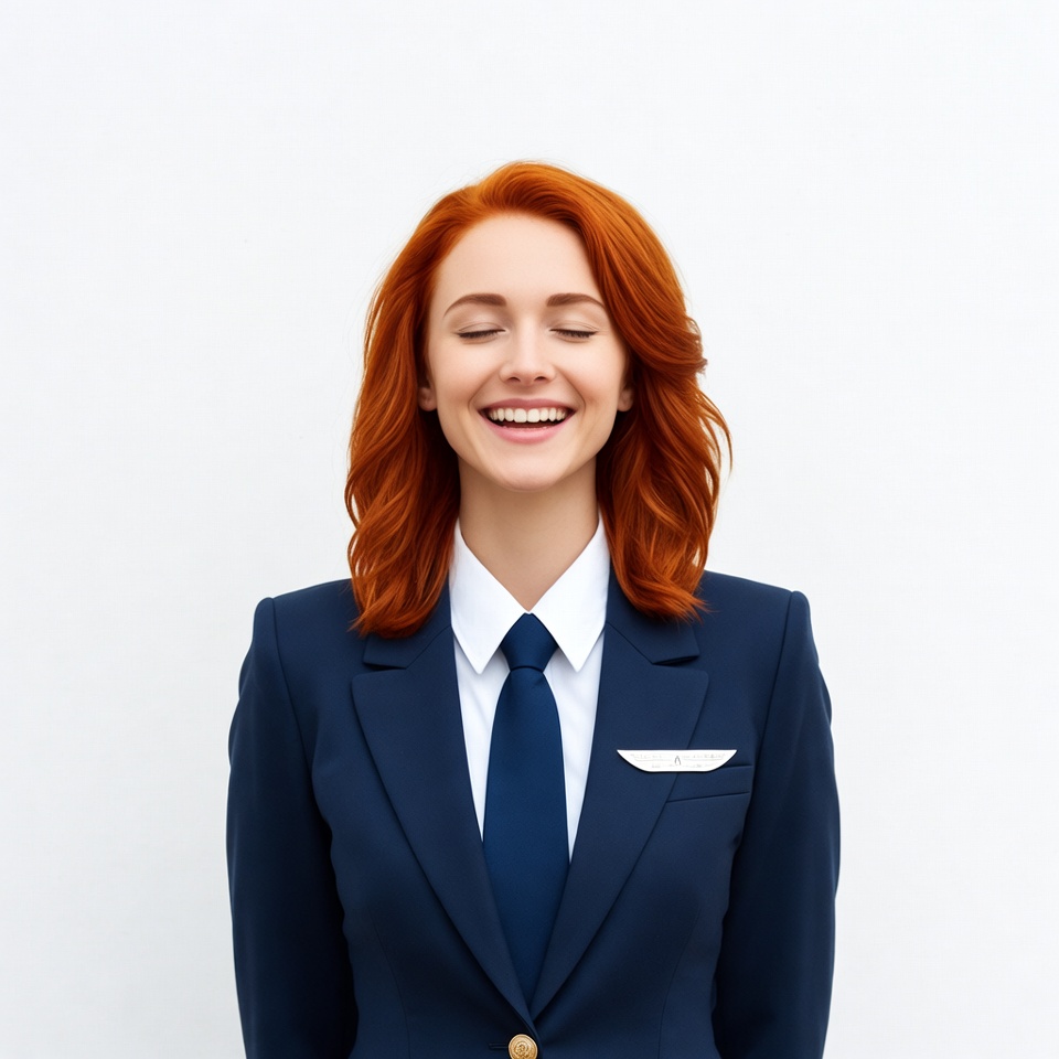 A young woman with long wavy red hair smiles happily with eyes closed against a white background. She wears a navy blue business suit, white collared shirt, blue tie, and a white pocket square. Her expression is joyful and relaxed.