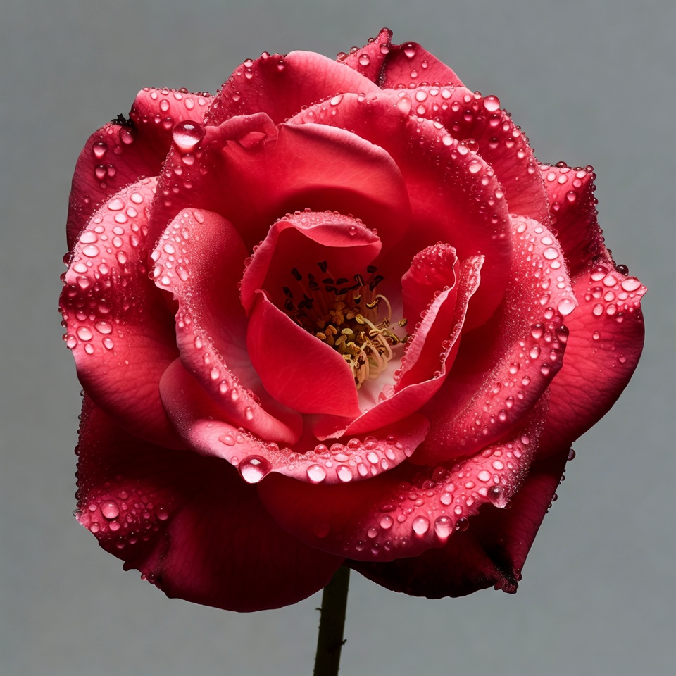 dew drops, dewy rose, floral, flower closeup, flower photography, fresh rose, garden flower, gray background, nature, petals, pink petals, rose bloom, rose flower, rose macro, stamens, stem, vibrant red, water droplets, red rose