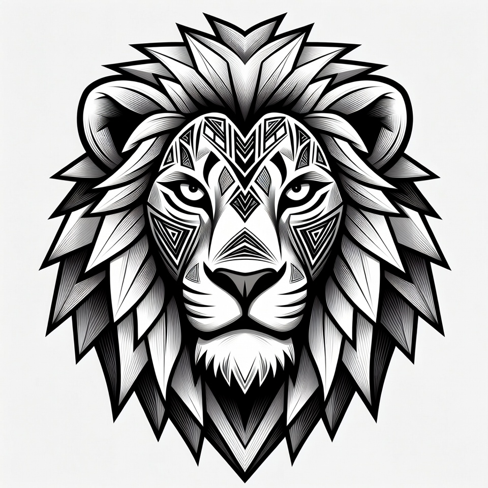 animal portrait, black and white, detailed mane, fierce eyes, geometric lion, ink drawing, isolated background, line art, lion face, lion illustration, majestic lion, mane, minimalist lion, roaring lion, savage lion, tribal lion, tribal pattern, vector art, wildlife art, lion head
