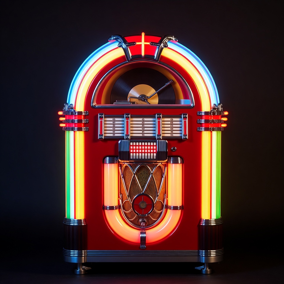 1950s style, 3D render, arcade machine, black background, blue neon, chrome accents, classic jukebox, colorful lights, glowing jukebox, green neon, isolated, music machine, neon lights, pink neon, record player, red jukebox, retro jukebox, turntable, vintage jukebox, vinyl record, jukebox
