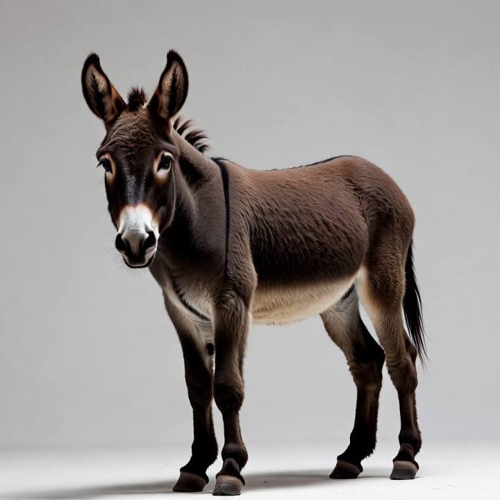 animal, brown donkey, burro, cute donkey, equine, farm animal, fluffy mane, hooves, isolated background, large ears, long ears, mammal, standing donkey, white background, white muzzle, donkey
