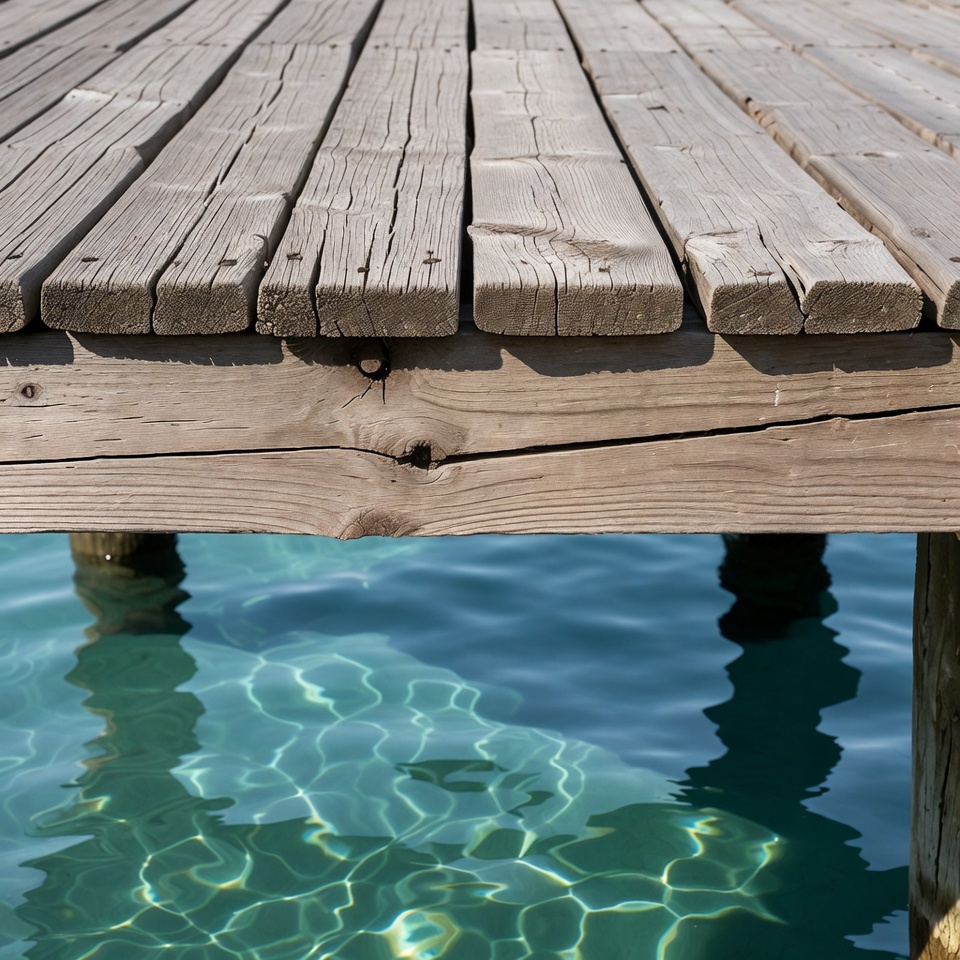 A weathered wooden pier extends over clear turquoise water. The image shows close-up planks and posts with rippling reflections below. Sunlight highlights the wood grain and water surface.