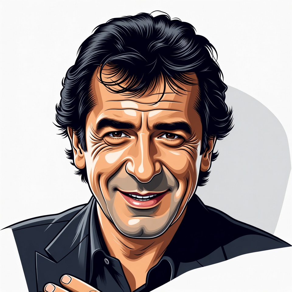 A vector illustration of a middle-aged man with thick wavy black hair and a smiling expression. He wears a black suit jacket over a white shirt and stands against a white background. His face features prominent cheekbones and expressive eyes.