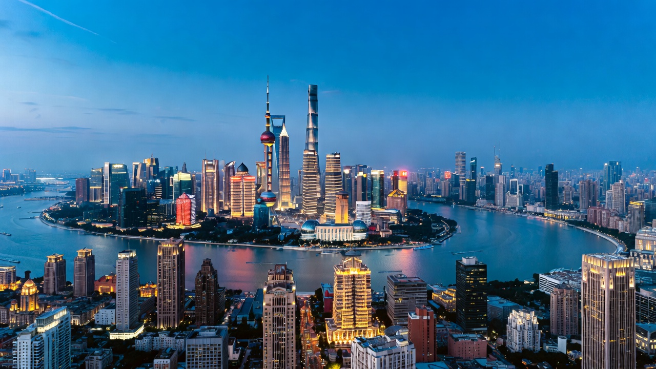 China, Huangpu River, Oriental Pearl Tower, Pudong, Shanghai Tower, aerial view, architecture, blue sky, buildings, cityscape, glowing lights, high-rises, illuminated, lights, metropolis, modern city, night, panorama, river, skyline, skyscrapers, twilight, urban, waterfront, Shanghai