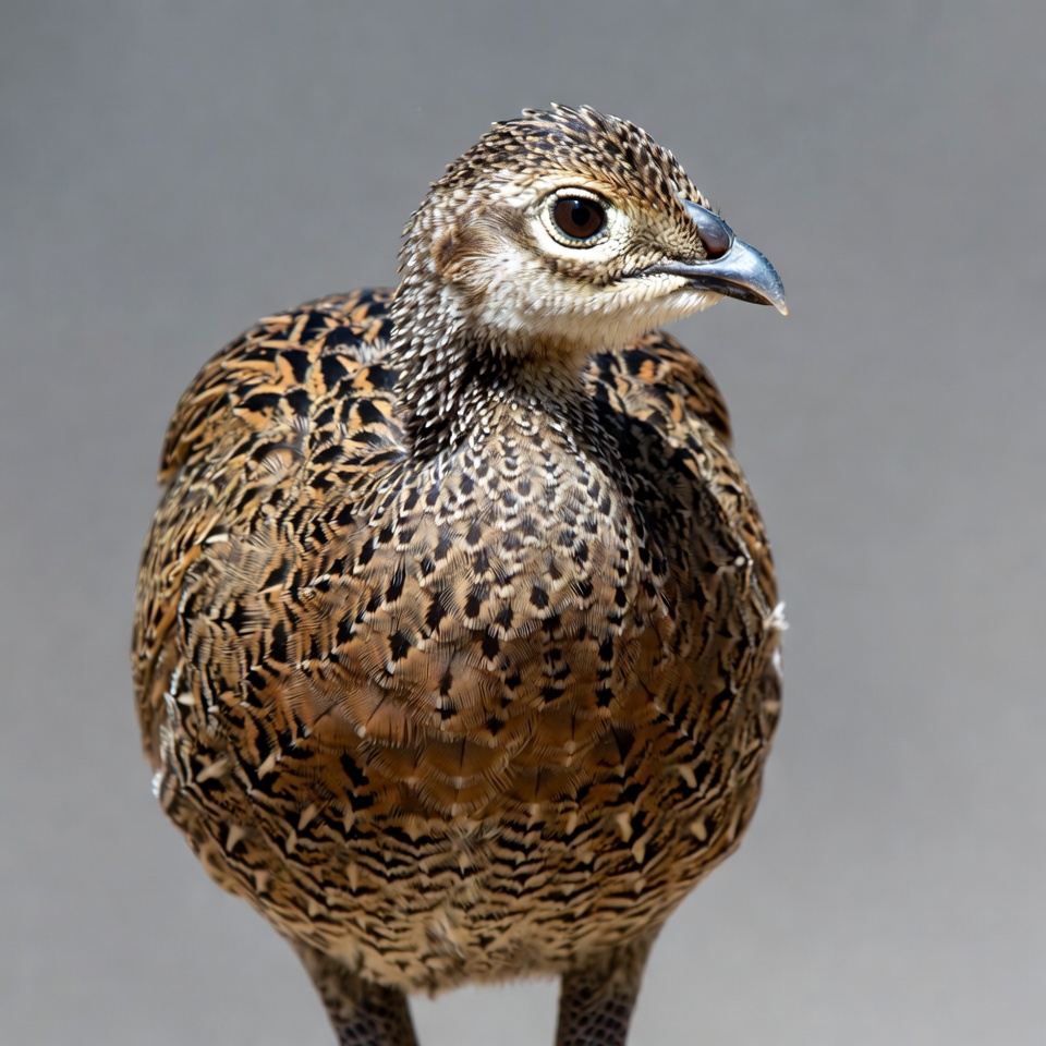 A plump ornate quail with intricate brown and black feather patterns stands facing forward on a plain gray background. Its large expressive eyes and small curved beak are prominently visible in the detailed close-up. The bird's feathers feature detailed scaling and warm tones.