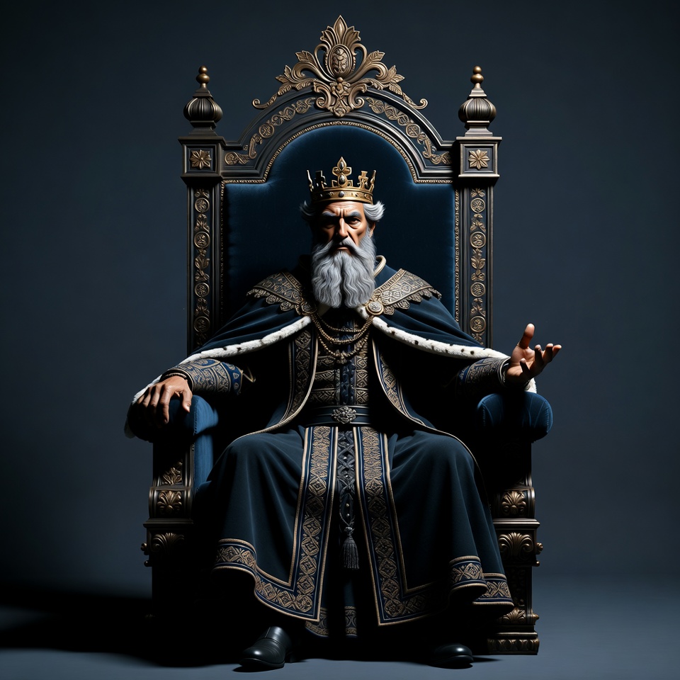 White, blue clothing, crown, dark background, elderly man, fantasy king, gesturing hand, gold trim, illustration, male, medieval king, ornate chair, regal pose, royal robe, sitting king, throne, white beard, king