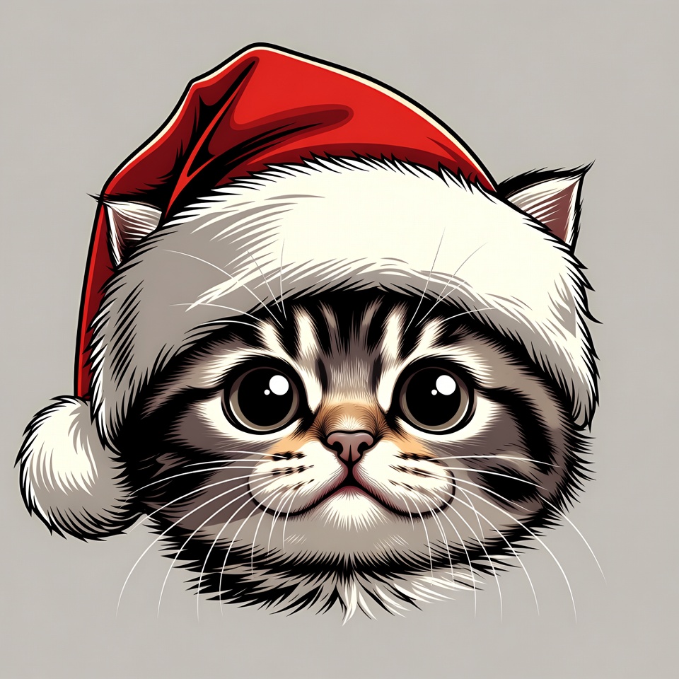 Christmas, Santa hat, adorable, animal, cat, cute, festive, fluffy fur, gray background, holiday, illustration, isolated background, pom-pom, red hat, smiling, tabby, vector art, white fur, wide eyes, kitten