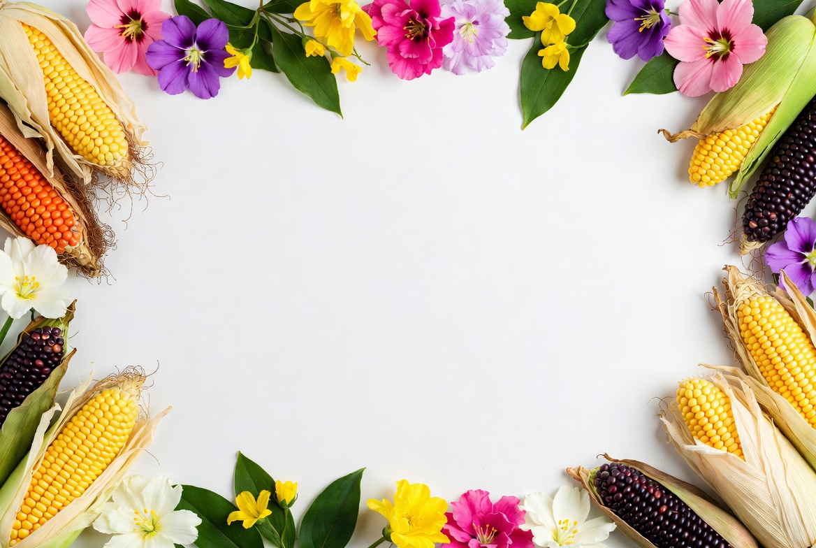 A vibrant border of multicolored corn cobs and various flowers surrounds a blank white space. Yellow, orange, purple, and black corn ears are arranged with pink, purple, yellow, and white blooms and green leaves. The composition is symmetrical and isolated on a white background.