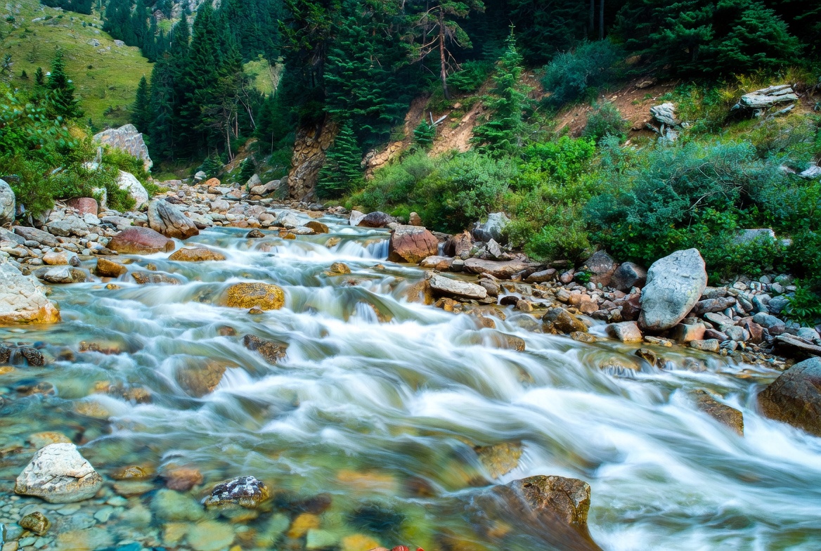 alpine, boulders, clear water, coniferous trees, evergreen trees, flowing water, foam, forest, green valley, landscape, long exposure, lush greenery, mountains, nature, outdoors, pebbles, rapids, river, riverbed, rocks, scenery, steep slopes, stream, turquoise water, mountain river