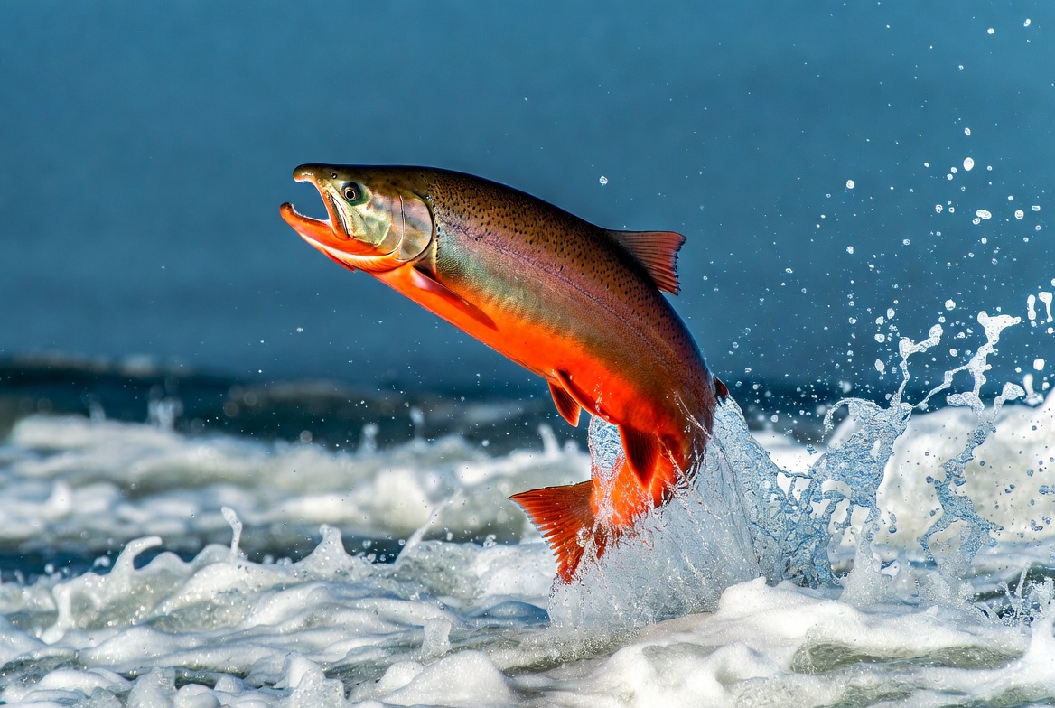 aquatic, blue water, fin, fish, freshwater fish, jumping, jumping fish, leaping trout, nature, orange fish, outdoors, river, salmonid, silver scales, splash, tail, trout, water, wildlife, rainbow trout