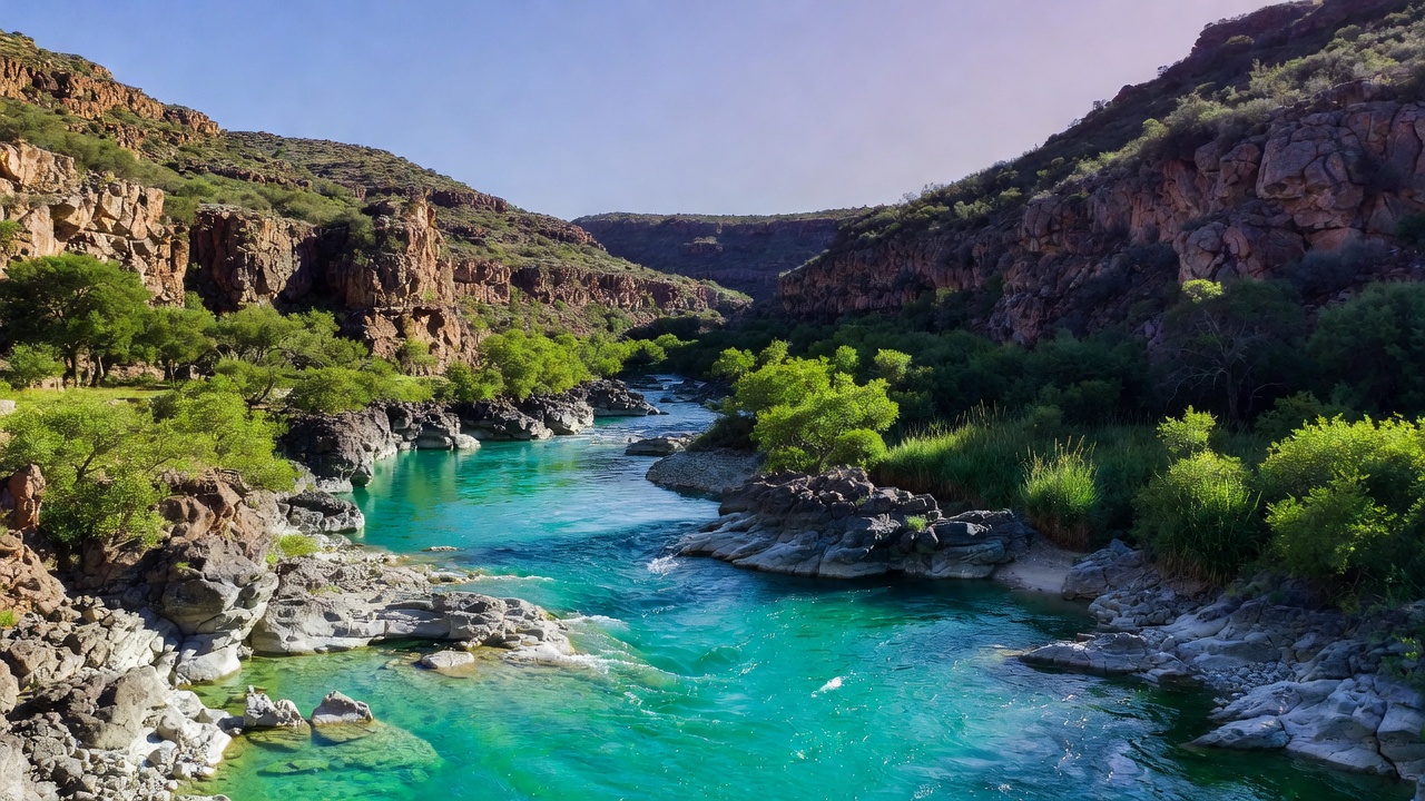 arid landscape, blue sky, boulders, canyon, cliffs, desert canyon, flowing river, green vegetation, landscape, lush greenery, nature, outdoor scenery, red rocks, river canyon, rock formations, scenic view, turquoise water, valley, waterway, river