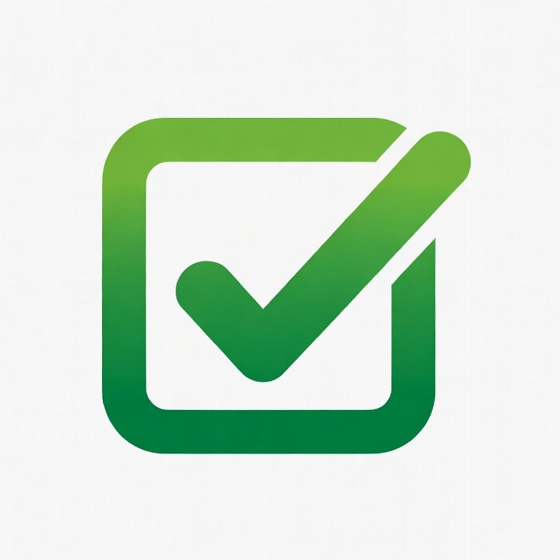 A vibrant green checkmark icon sits inside a square outline on a white background. The checkmark and square feature a gradient green color with a modern, bold design. It is a simple vector illustration isolated on a transparent background.