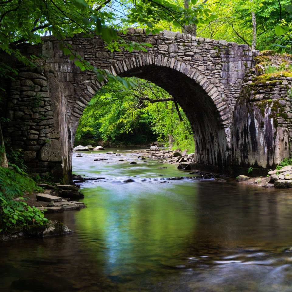 arch bridge, bridge over water, canopy, clear water, flowing water, forest bridge, forest path, green trees, greenery, landscape, lush foliage, mossy stones, natural arch, nature, outdoor, river bridge, riverbank, rocks, rocky stream, stone arch, stream, sunlight, trail bridge, woodland, stone bridge
