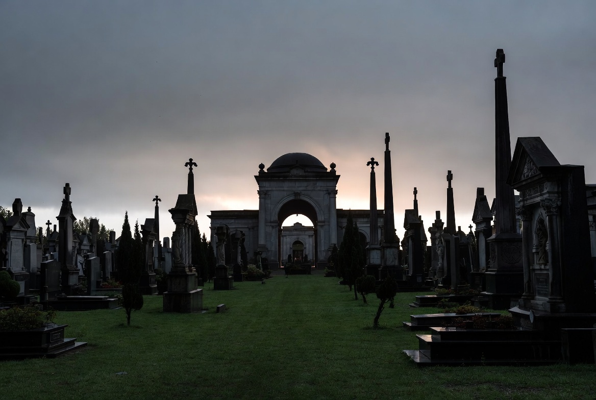 arch, burial ground, cloudy sky, crosses, dome, dusk, foggy atmosphere, gothic, grass, gravestones, graveyard, historic cemetery, lawn, mausoleum, memorials, monuments, obelisks, overgrown grass, silhouettes, tombstones, trees, cemetery