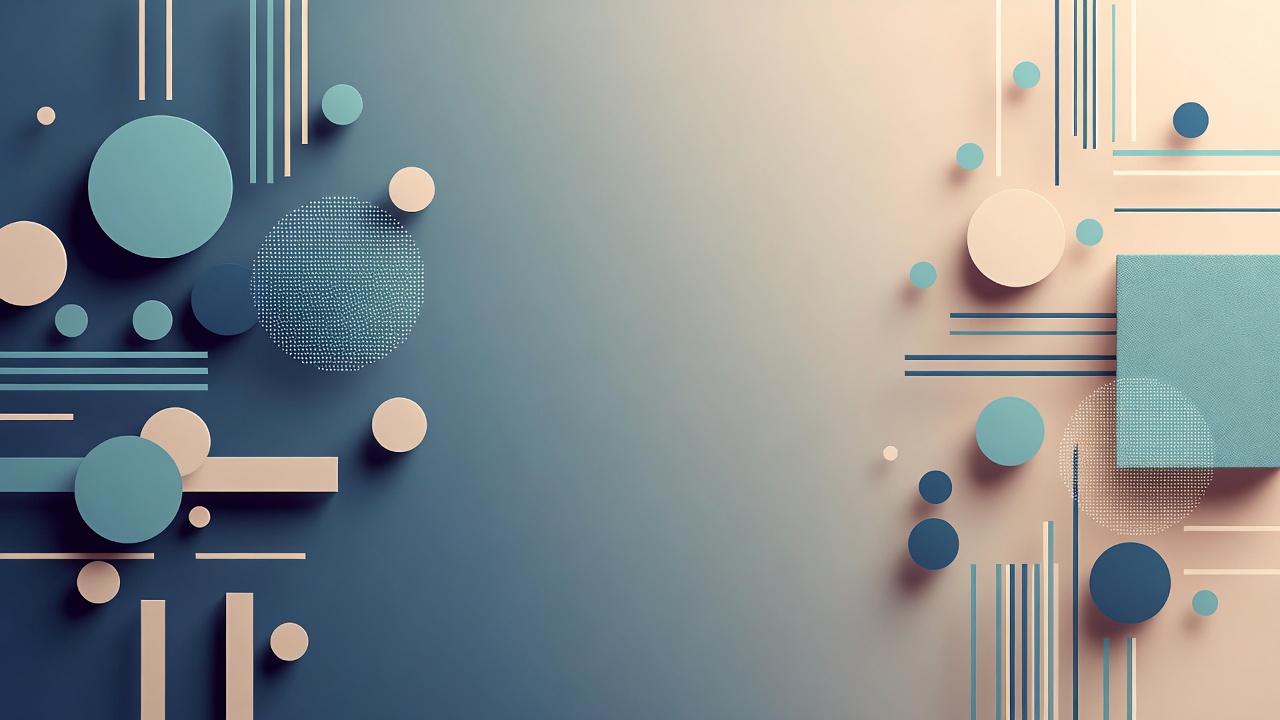 A 3D abstract composition features overlapping circles, squares, and lines in shades of blue and beige. Various sized teal and navy discs float against a gradient background transitioning from dark blue to light tan. Thin vertical and horizontal bars add structure to the geometric design.