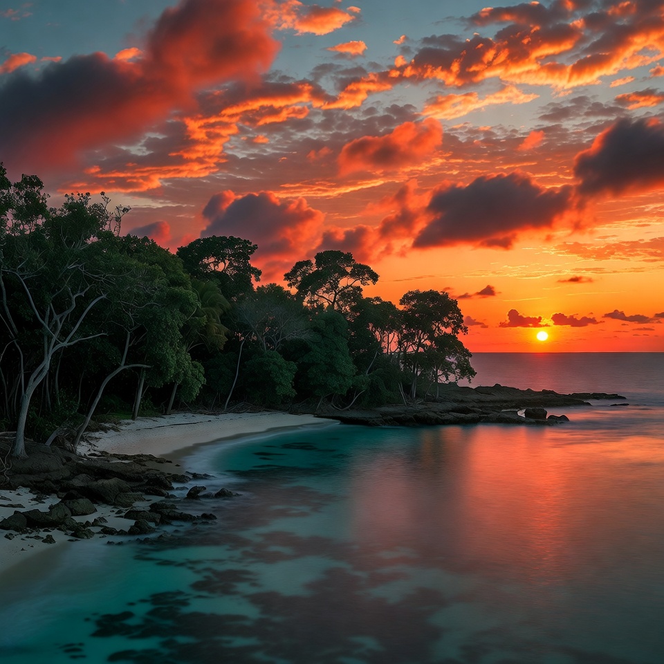 A vibrant sunset illuminates the sky with orange and red clouds above a sandy beach lined with green trees. Turquoise water laps against rocks in the foreground, reflecting the warm sunset hues. The sun dips toward the horizon over calm ocean waters.