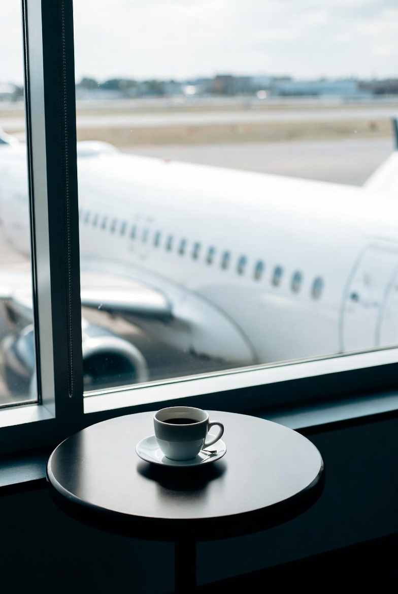 airplane, airport, aviation, black coffee, cloudy sky, cup, lounge, plane, runway, saucer, table, tarmac, travel, window, coffee