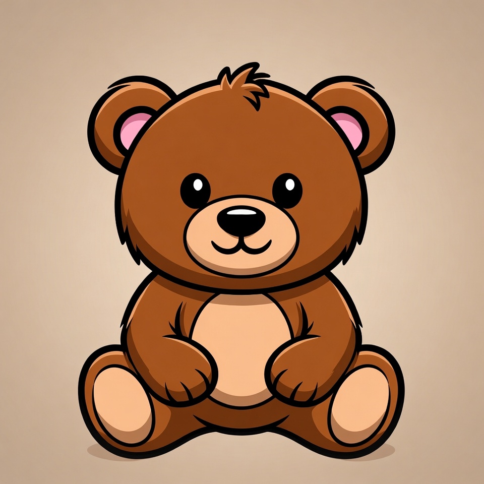 A cute brown teddy bear with big sparkling eyes sits on a plain beige background. The cartoon illustration features fluffy fur, pink inner ears, a small black nose, and a gentle smile. Its paws rest on its round belly in a charming pose.