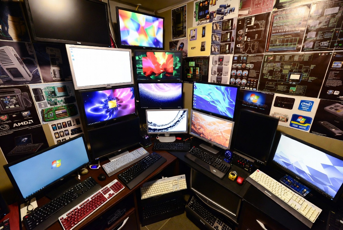 A large desk features multiple computer monitors arranged in a curved array, displaying colorful graphics, desktop icons, and abstract visuals. Keyboards, mice, and PC components surround the central setup in a dimly lit room with posters and tech decorations on the walls. The configuration showcases a high-end battlestation with various screen sizes and vibrant displays.