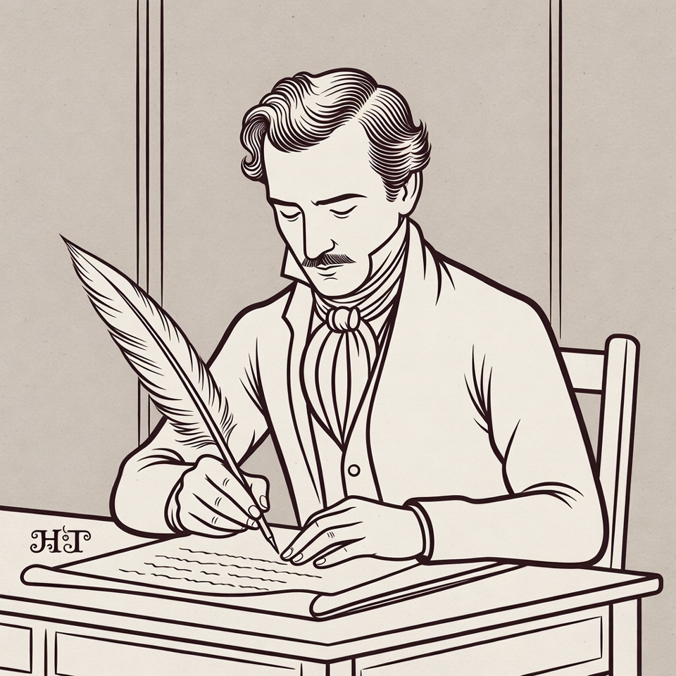 A line art illustration depicts a man with curly hair and a mustache seated at a wooden desk, writing on paper with a feather quill pen. He wears a historical vest, cravat, and coat. The scene features simple line drawings against a plain background.