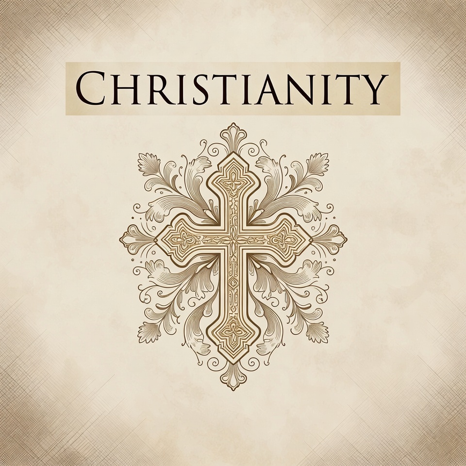An intricate gold cross with floral flourishes is centered on a textured beige background. The text 'CHRISTIANITY' appears twice in elegant white lettering above and below the cross. The design features symmetrical decorative elements in a vintage style.