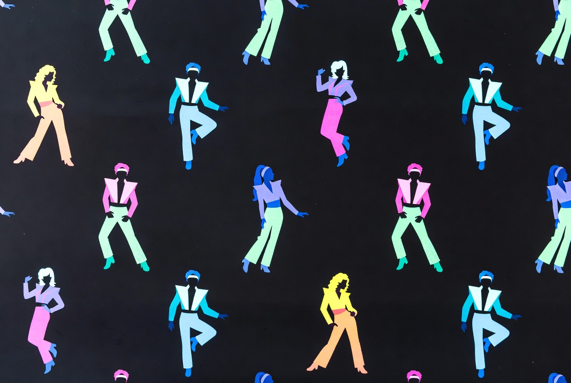 A vibrant pattern features numerous stylized silhouette figures of women dancing dynamically against a black background. The figures are depicted in various neon colors including pink, green, yellow, purple, and blue, with exaggerated 80s hairstyles and legwear. They are shown in energetic poses with arms raised and legs kicking.