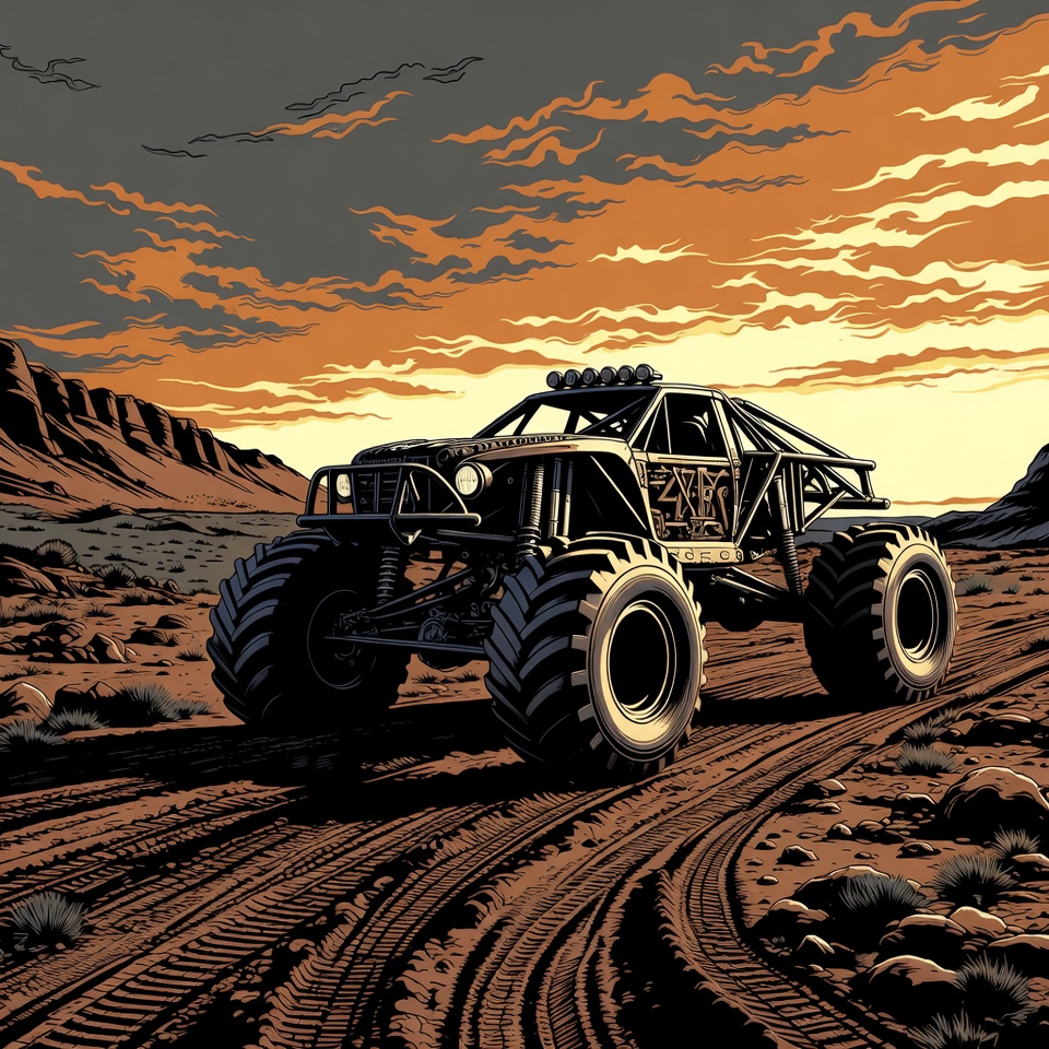 A detailed illustration of a rugged black monster truck with oversized tires drives along a dirt trail in a barren desert landscape. Jagged rock formations rise in the background under a dramatic sunset sky with orange and purple hues. The scene features a dynamic off-road racing style with bold lines and shading.