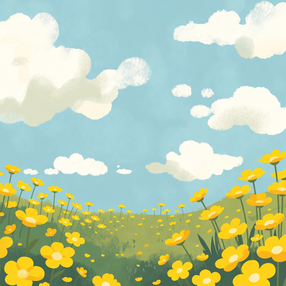 A vibrant illustration shows a lush green field covered in blooming yellow flowers. Fluffy white clouds float in a bright blue sky above the rolling hillside. The scene features a watercolor-style artwork with vivid colors and soft brush strokes.