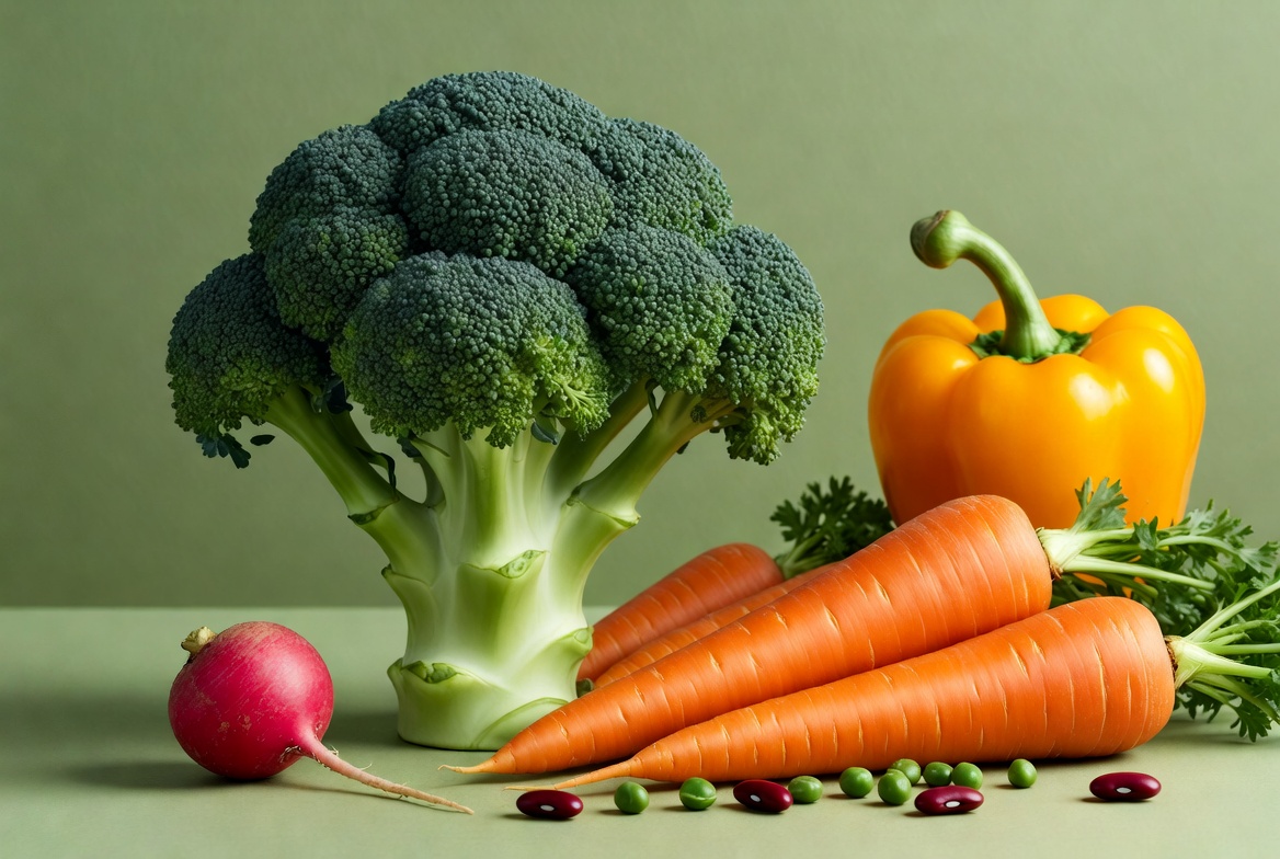 bell pepper, carrots, food photography, fresh produce, green background, green beans, healthy food, isolated background, orange carrots, radish, red radish, vegetables, veggie arrangement, yellow pepper, broccoli