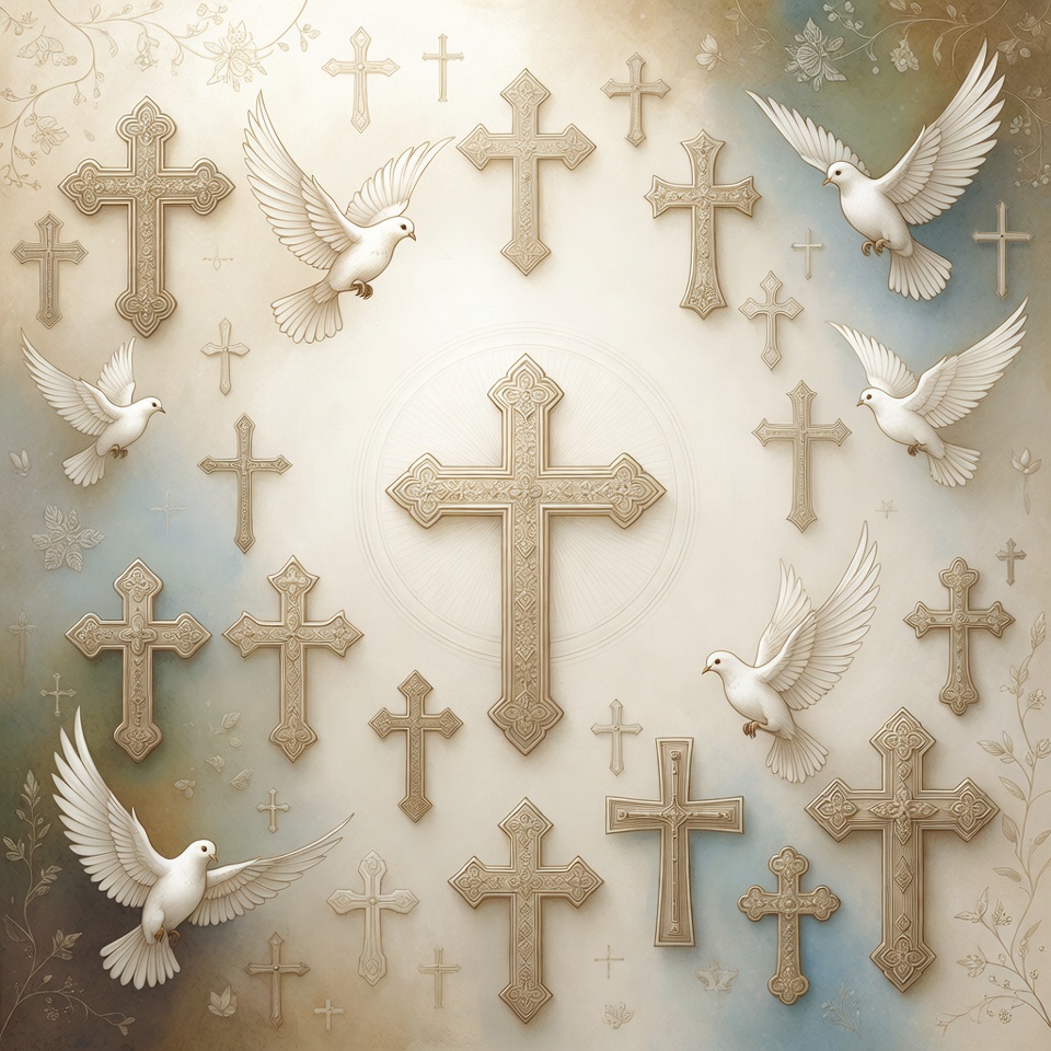A digital illustration features multiple ornate white crosses arranged in a circular pattern on a soft beige and blue gradient background. White doves with outstretched wings fly amidst the crosses, adding a sense of movement. Delicate floral elements and a glowing central cross enhance the ethereal design.