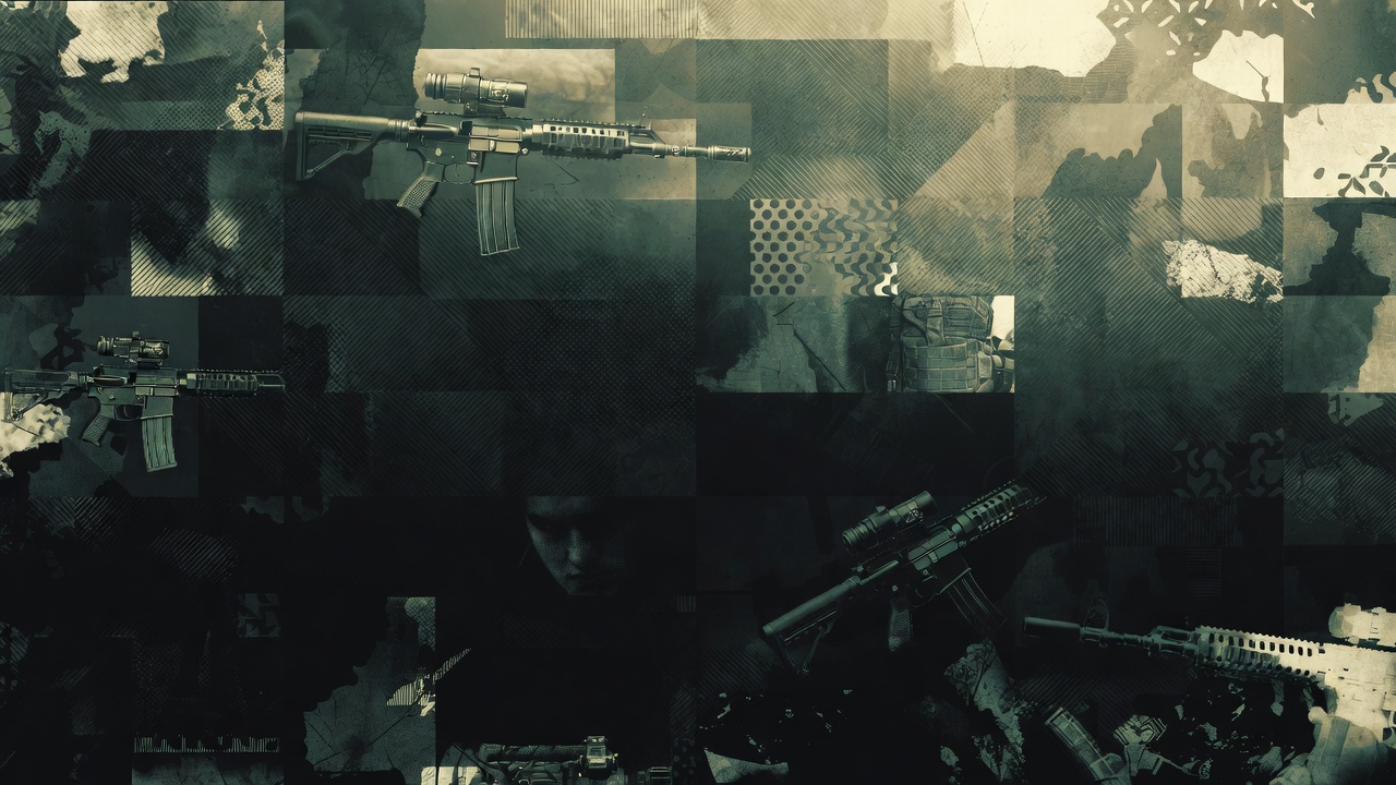 A dark green-toned collage features multiple AR-15 rifles with scopes and tactical accessories arranged in a grid pattern. A shadowy male soldier in helmet and gear appears in one section, peering forward. The composition uses fragmented panels with abstract overlays for a gritty, militaristic effect.