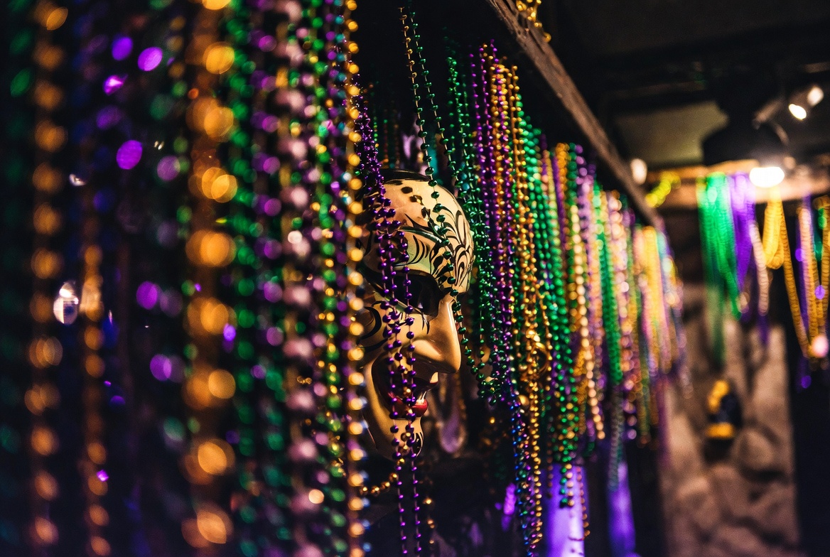 New Orleans, beads, beads display, carnival mask, decorative mask, dim lighting, festival decoration, floral mask, gold beads, gold strands, green beads, green mask details, hanging beads, mask collection, masquerade mask, party beads, purple beads, purple strands, rack, white mask, Mardi Gras mask