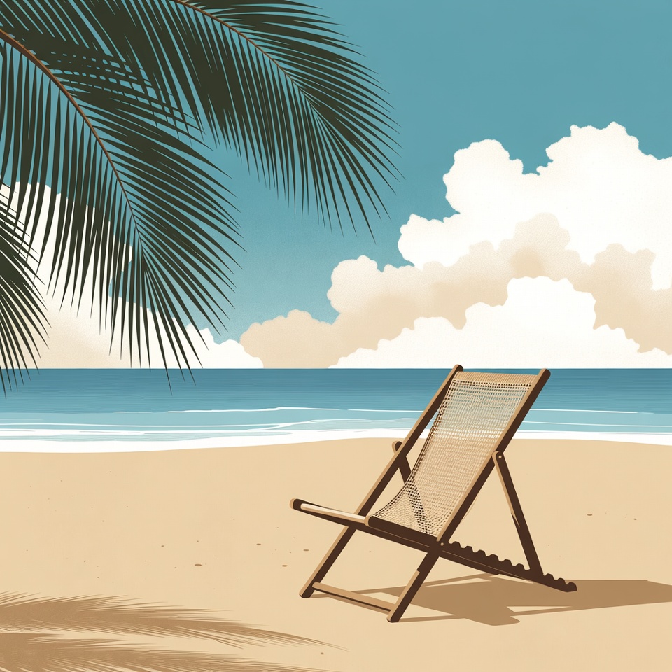 A wooden beach chair sits on golden sand near the ocean, shaded by large green palm tree fronds. Fluffy white clouds float in the bright blue sky above the calm blue sea. The scene features a clean, isolated tropical beach illustration.