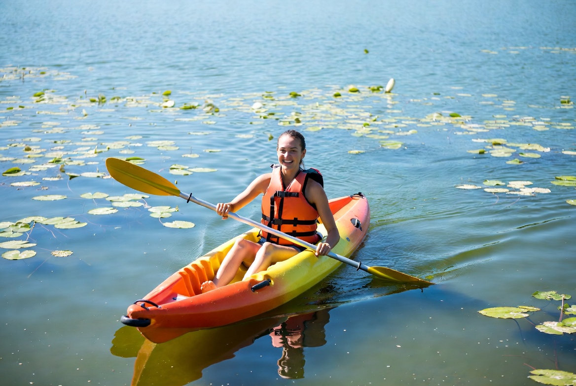 A young White woman wearing an orange life jacket paddles a yellow and orange kayak through calm lake water surrounded by green lily pads. She holds a yellow paddle with both hands and smiles while seated in the kayak. The scene features clear blue water and natural aquatic plants.