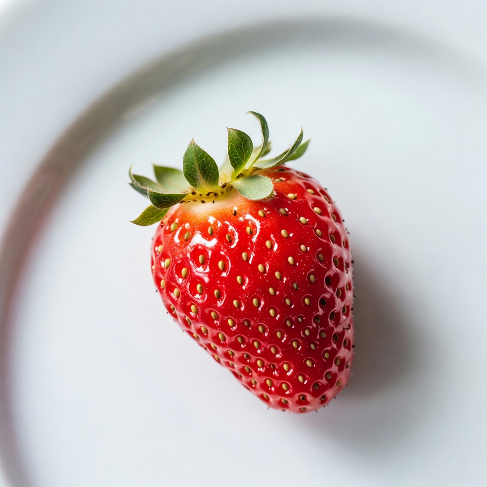 A single fresh red strawberry with green leaves sits centered on a plain white plate. The strawberry's glossy surface shows tiny seeds and a vibrant hue. The white plate provides a clean, isolated background.