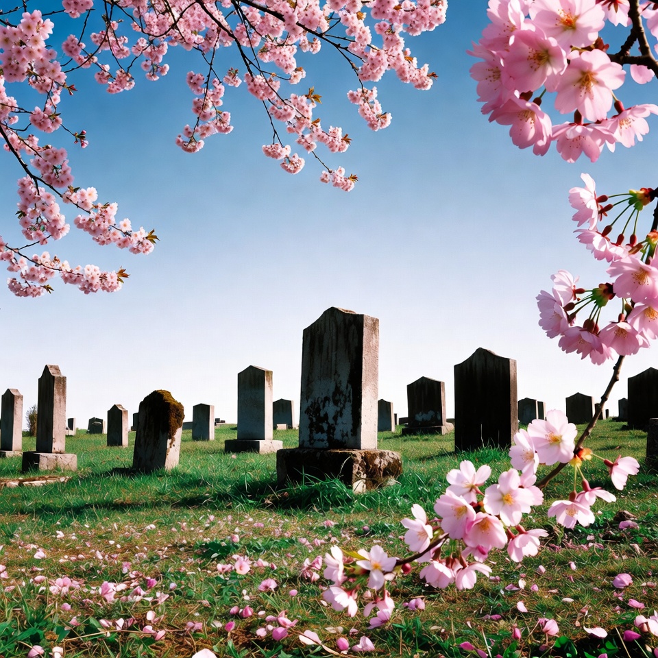 Cherry Blossoms Over Cemetery Gravestones