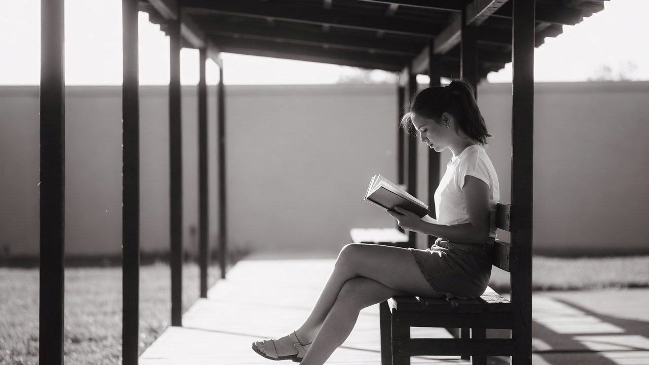 A young Asian woman with hair in a ponytail sits on a wooden bench under a covered walkway, reading a book intently. She wears a white t-shirt, short skirt, and flat shoes, with her legs crossed. The image is in black and white, featuring tall pillars, a plain wall, and grass in the background.