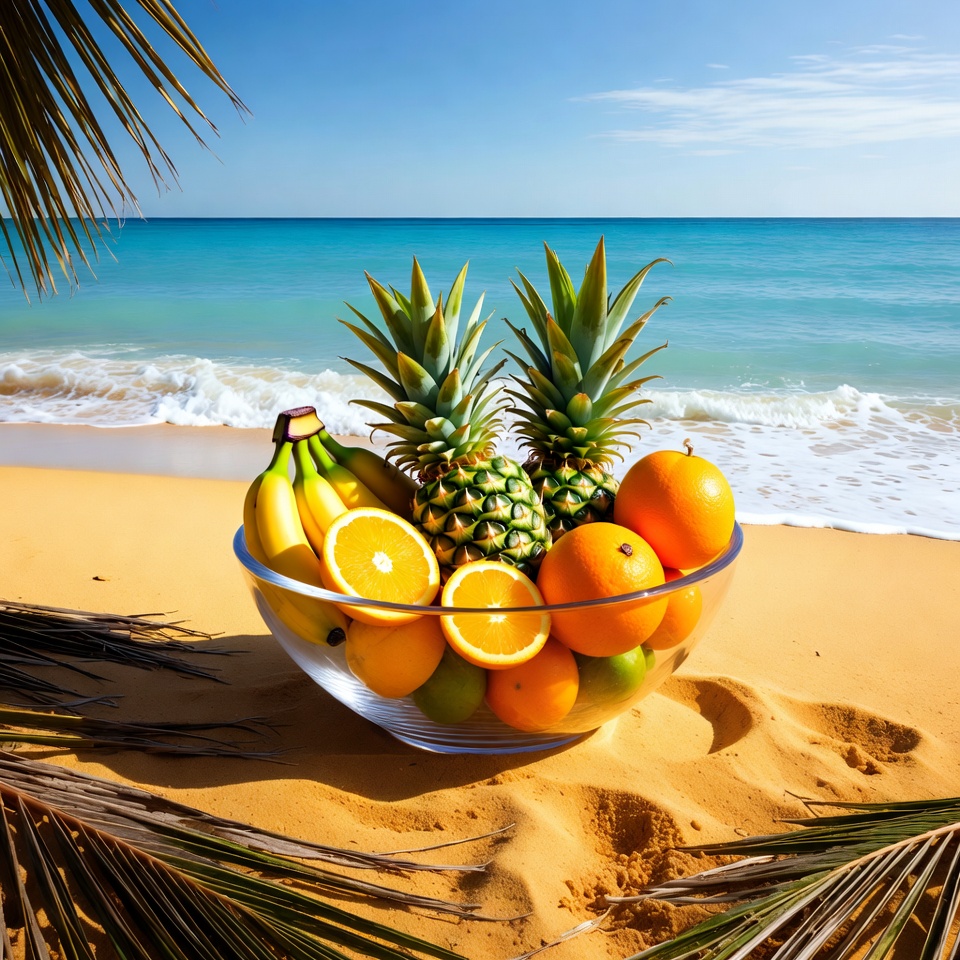A large glass bowl filled with sliced oranges, bananas, pineapples, and limes sits on a sandy beach. Palm leaves frame the bowl against a backdrop of turquoise ocean waves and a clear blue sky. The vibrant fruits are arranged prominently in the foreground.
