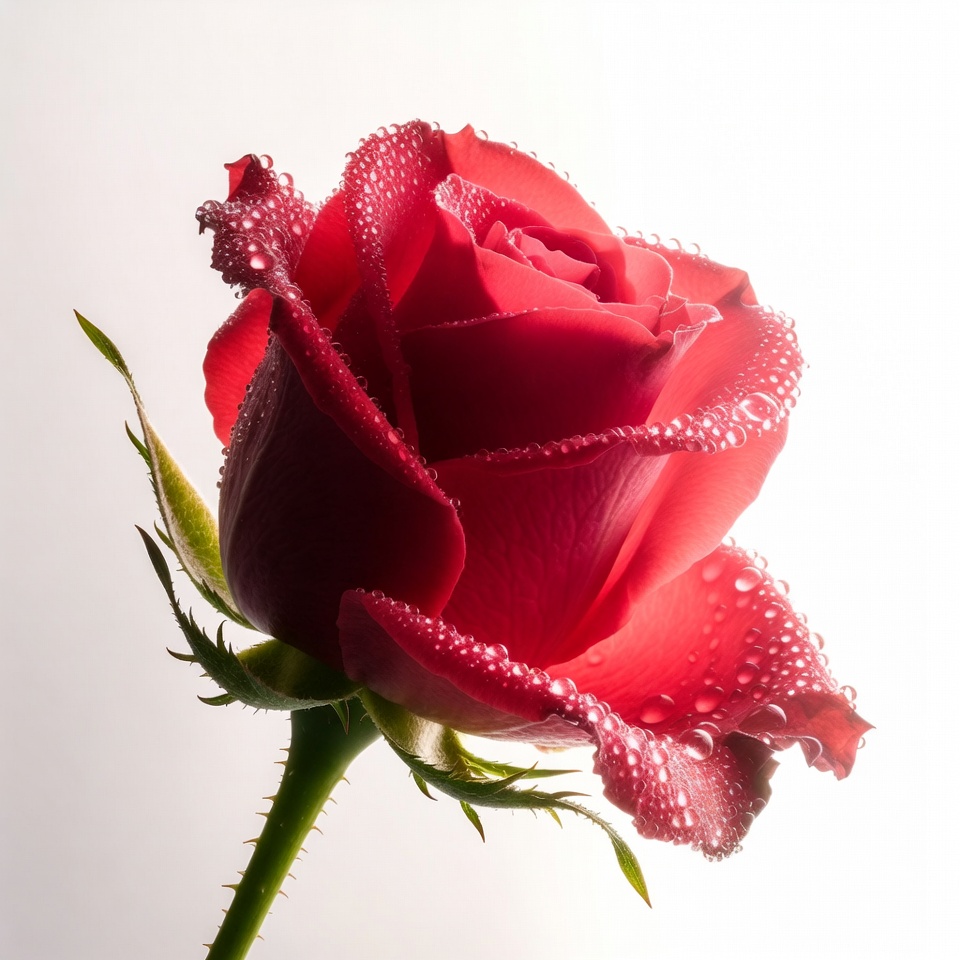 A vibrant red rose with water droplets on its petals stands against a white background. The flower features slightly curled edges and a green stem with thorns. Fresh dew glistens on the velvety petals.