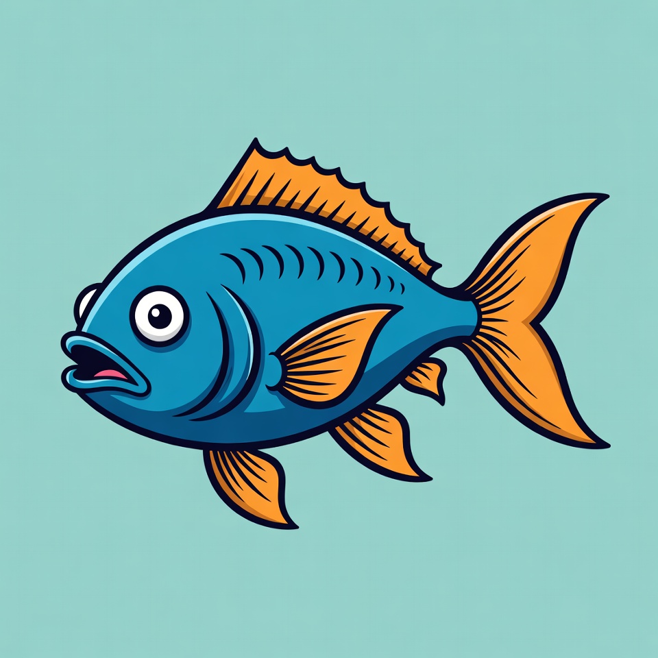 A vibrant cartoon illustration of a blue fish with large expressive eyes and an open mouth. It features orange fins and detailed scales on a light turquoise background. The fish faces left in a playful style.