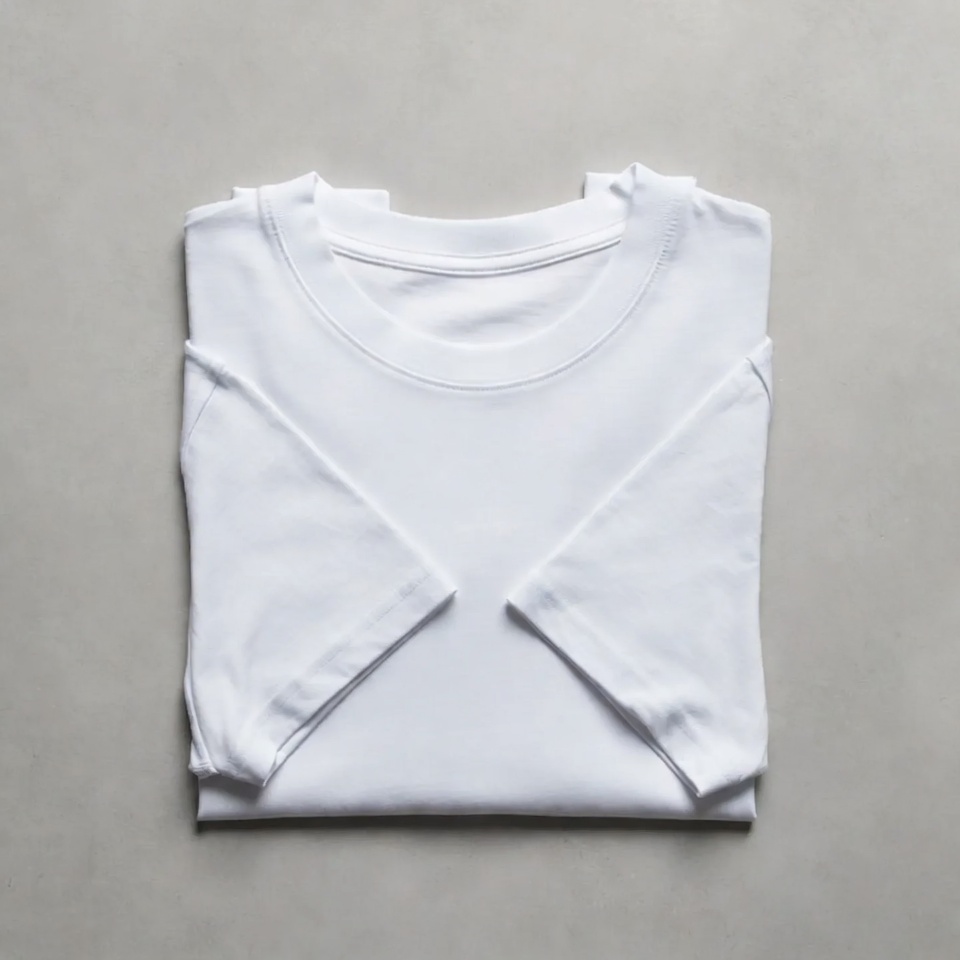 A clean white T-shirt is neatly folded with sleeves crossed over the front. It features a classic crew neck design and lies flat on a smooth gray surface. The fabric appears soft and crisp with even stitching.