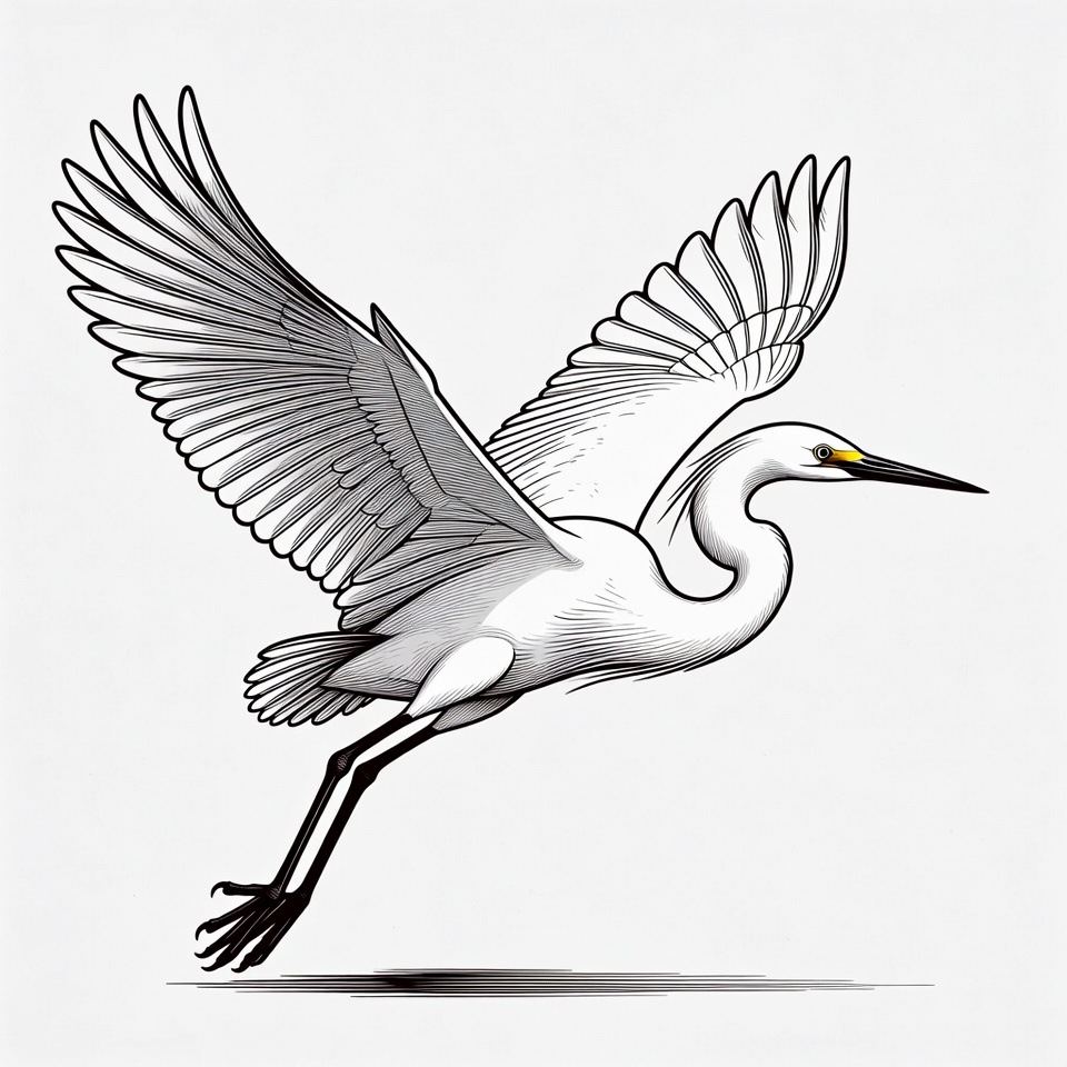 A detailed line art illustration of a white egret in flight with large wings fully extended. The bird features a long pointed beak with a yellow tip, slender neck, and long black legs trailing behind. It is depicted against a plain white background with subtle shading.