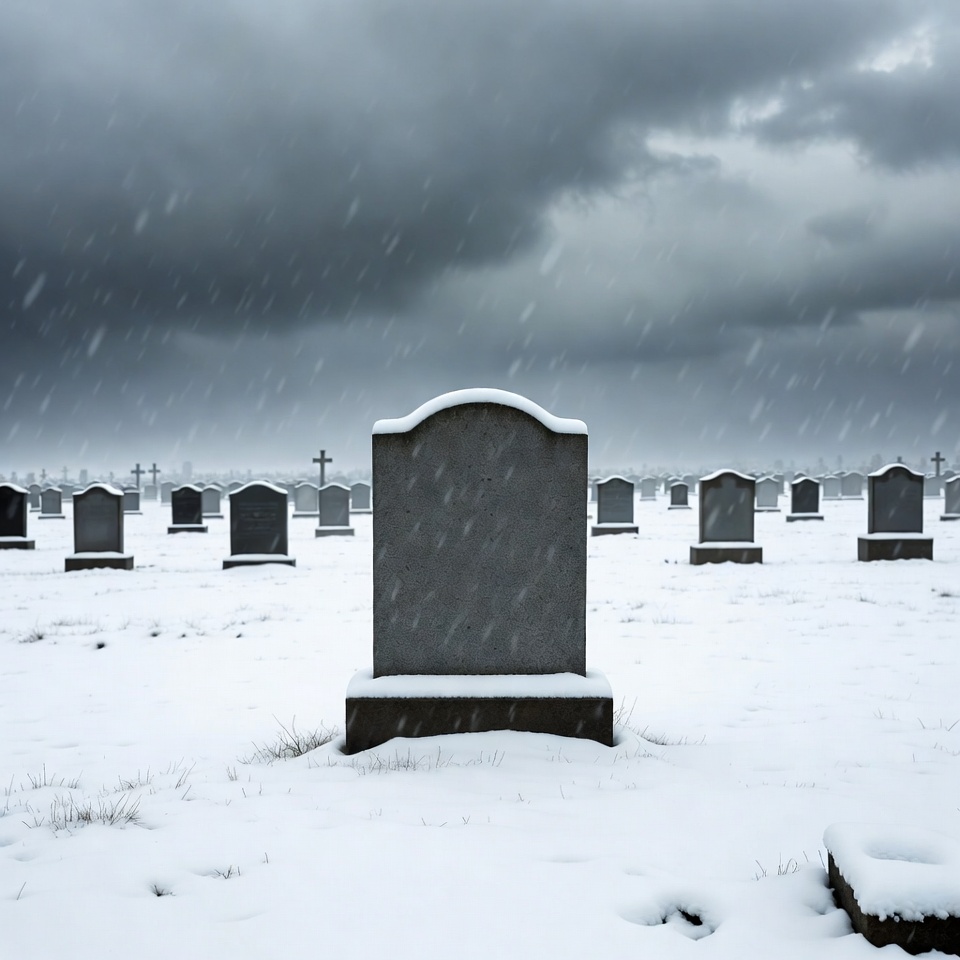 A snowy cemetery features numerous gray gravestones and crosses covered in snow under a dark, stormy sky. Heavy snowfall falls over the scene, with a prominent blank gravestone in the foreground. The ground is blanketed in white snow, and distant gravestones recede into the foggy background.