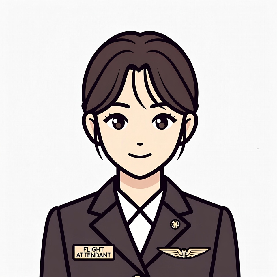 A cute cartoon illustration of an Asian woman dressed as a flight attendant. She has short dark brown hair, large expressive eyes, and a friendly smile. She wears a navy blue uniform with white shirt, name tag reading 'Flight Attendant', and winged badge on an isolated white background.